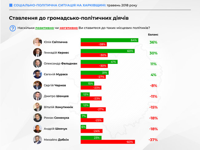 "Среди местных лидеров позитивно оценивают работу Юлии Светличной, главы ОГА, 64% опрошенных респондентов. Позитивная оценка Мэра Харькова Геннадия Кернеса – 60%. Баланс позитив-негатив у Светличной – 36%, у Кернеса – 30%. Самый высокий уровень негатива – у Михаила Добкина (60%)", – сообщается в исследовании.