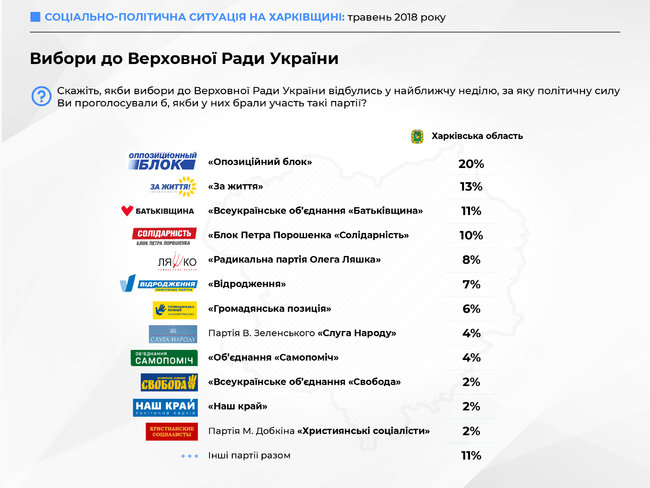 "Оппозиционный блок готовы поддержать на выборах 20% опрошенных жителей региона. Второе место – у партии "За життя" с 13% поддержки. Третье – у "Батькивщины", которую готовы поддержать около 11% опрошенных, четвертое – БПП "Солидарность" – 10%", – говорится в исследовании.