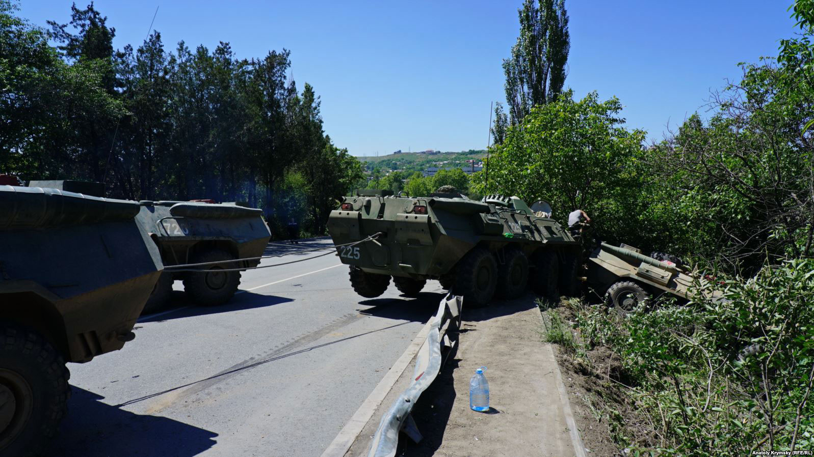 В Крыму, неподалеку от Симферополя, 14 мая российский военный бронетранспортер, который буксировал на жесткой сцепке неисправный бронетранспортер, стесал несколько десятков метров отбойника объездной ялтинской трассы.