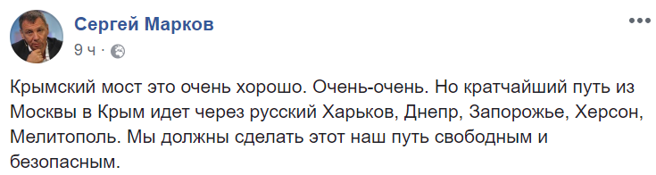 "Крымский мост это очень хорошо. Очень-очень. Но кратчайший путь из Москвы в Крым идет через русский Харьков, Днепр, Запорожье, Херсон, Мелитополь", - заявил он.