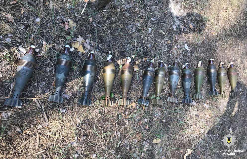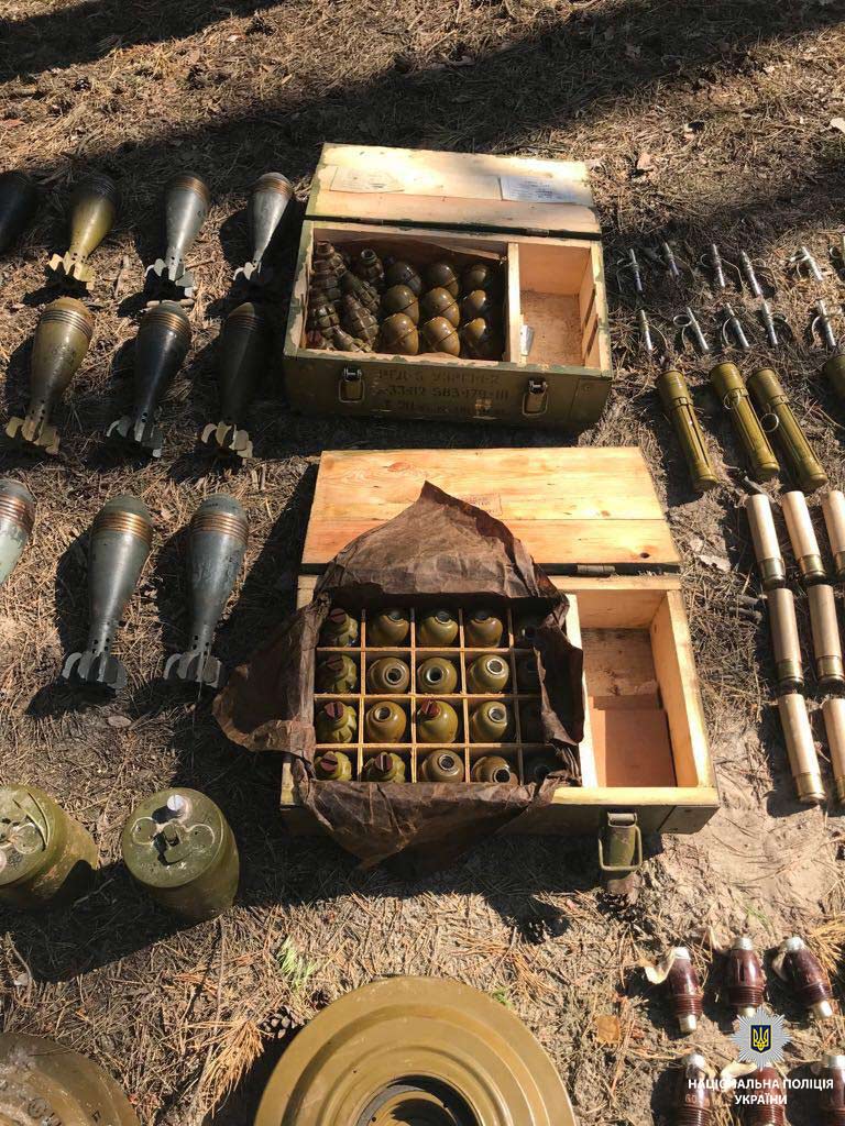 У замаскованій схованці невідомі зберігали близько 250 гранат ВОГ, 37 мін, 23 гранати РГД-5 та 13 гранат Ф-1, майже 500 патронів калібру 12.7 мм, запали, постріли до гранатомету та інші армійські боєприпаси.
