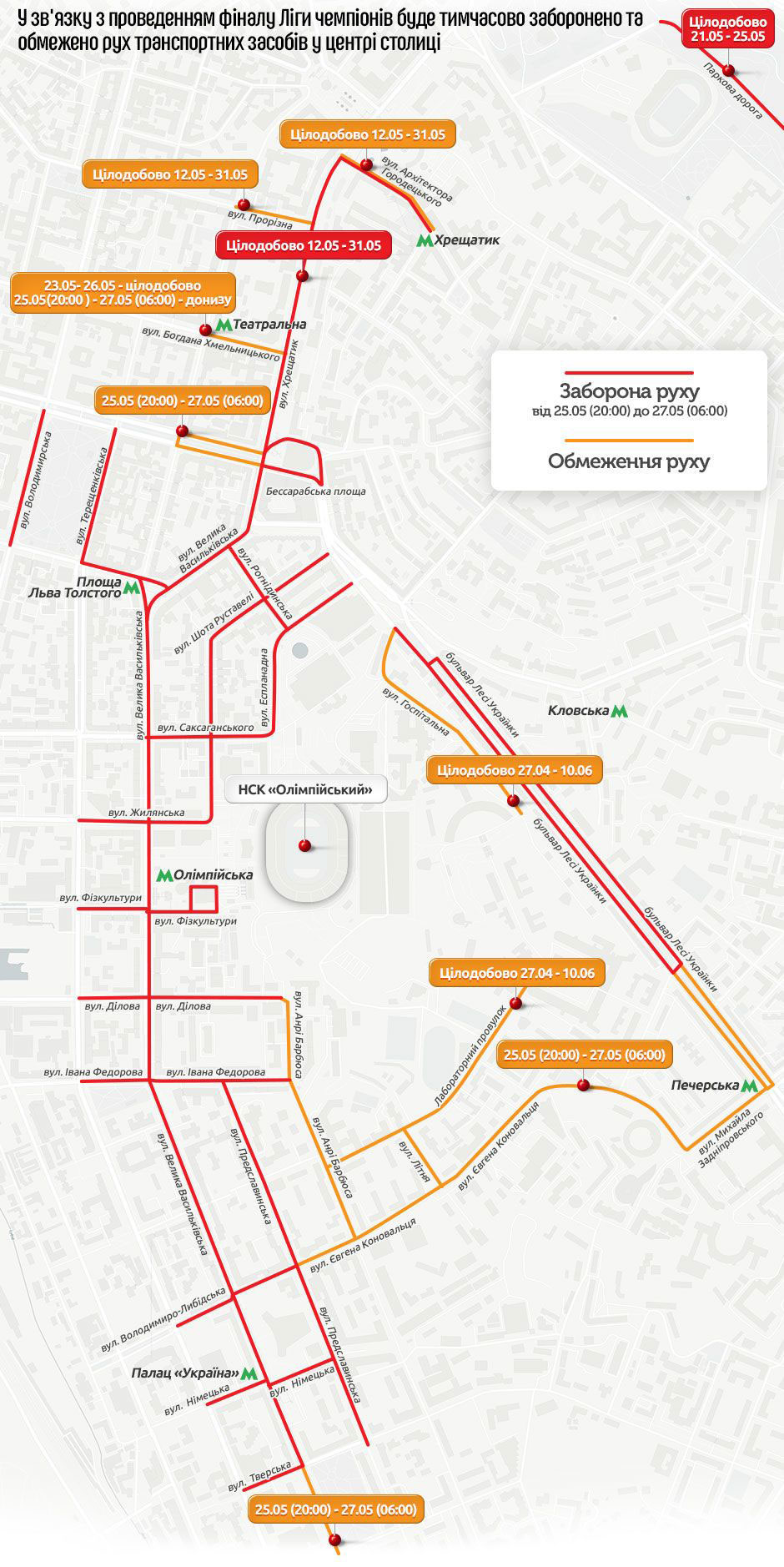 Сегодня вечером в Киеве запретят движение транспорта по дорогам, прилегающим к НСК "Олимпийский". Все – из-за финала Лиги чемпионов, который состоится 26 мая. В центре столицы организуют полуторакилометровую пешеходную зону.