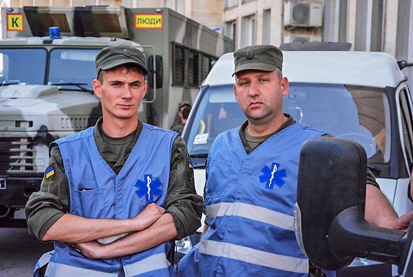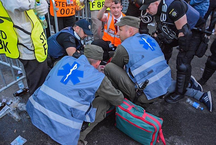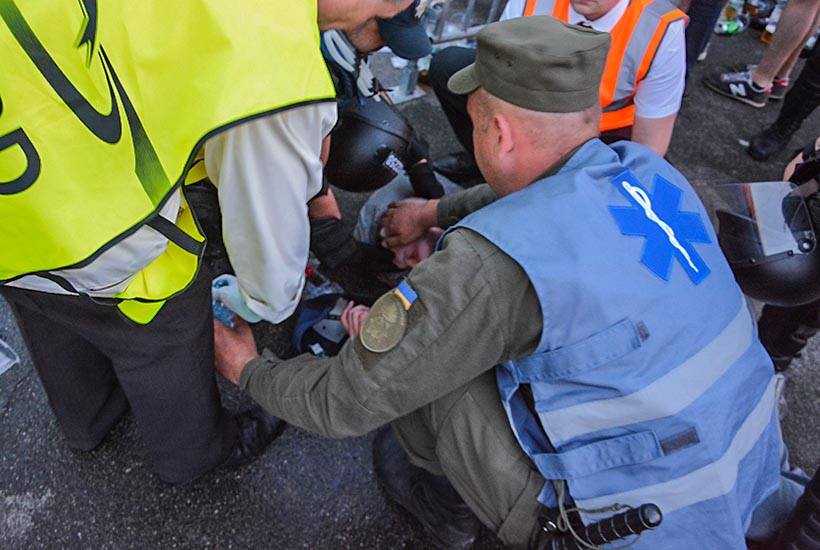 До військових медиків, що чергували біля стадіону «Олімпійський» під час проведення фіналу Ліги Чемпіонів звернулися два поліцейських та попросили надати допомогу. Лейтенанти медичної служби Костянтин Клочіхін та Артур Лазарченко негайно поспішили за правоохоронцями.