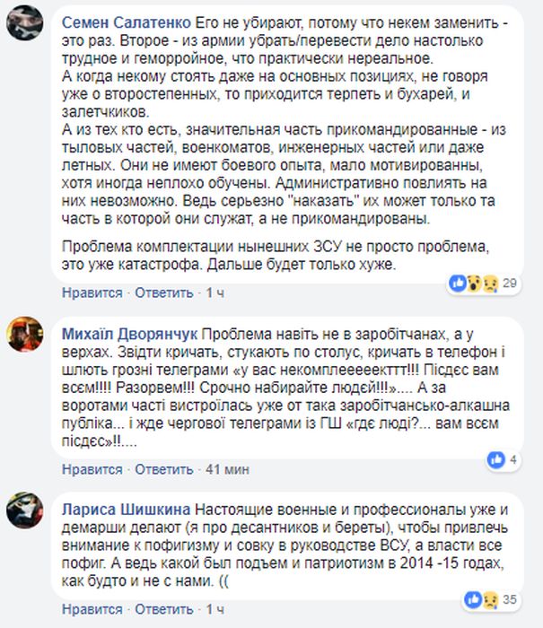 Результат некомплекта, который пополняют "заробитчане". Когда некомплект на передовой достигает 60-70%, то выбор невелик. Сидит такой "залетчик", бухает, нарушает дисциплину, конфликтует, всем недоволен, а его не убирают, потому что и такой для чего-то да пригодится. Например, 35-летний Виталий Чмиль из Николаева, из 36-й бригады, пошел в ВСУ в августе 16-го, а теперь бросил семью в Николаеве, решил стать звездой российского телевидения, принимает участие в телепостановках противника.