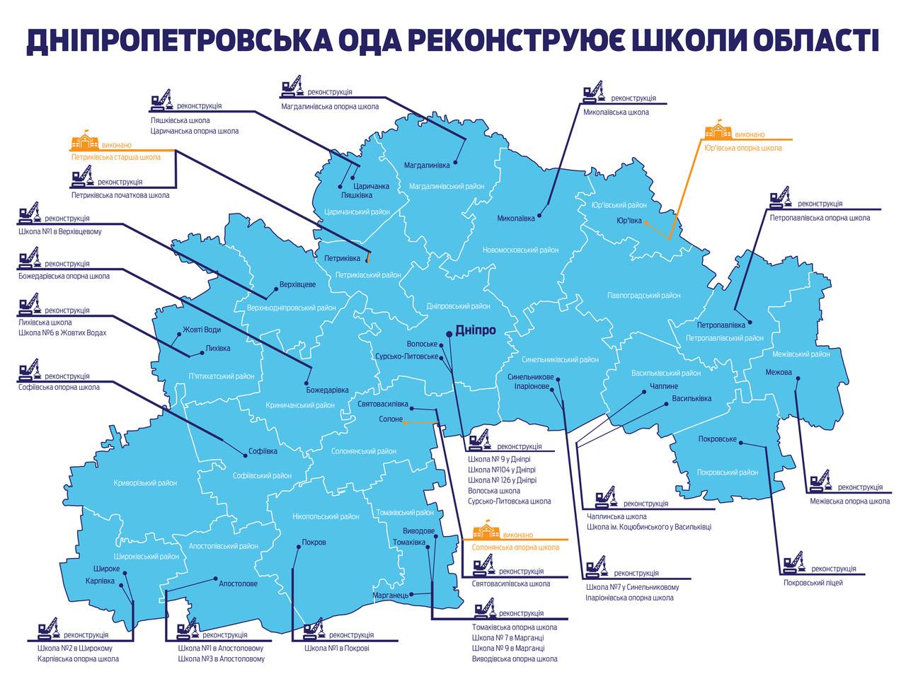 На карте есть 3 опорных школы, которые реконструированы уже - Юрьевская, Солонянская, Петриковская старшая школы.