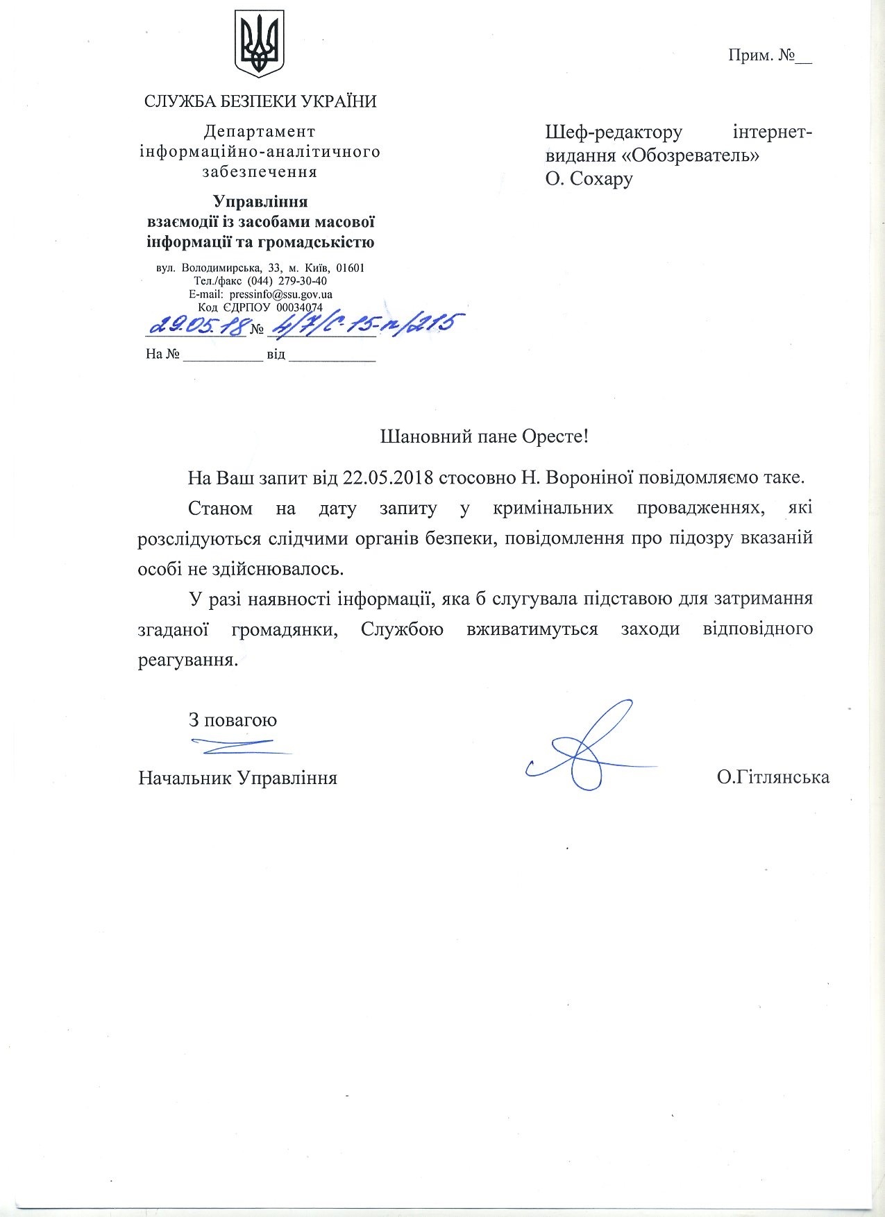 "По состоянию на дату запроса по уголовным производствам, которые расследуются следственными органами безопасности, сообщение о подозрении указанному лицу не осуществлялось", - ответили OBOZREVATEL в СБУ.