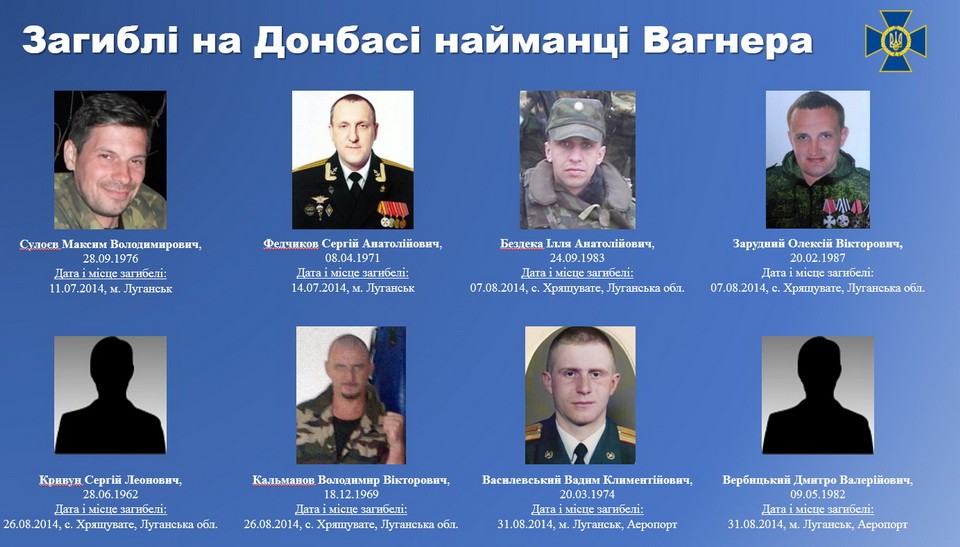 Также СБУ опубликовала информацию, согласно которой группа из 86 бойцов «Вагнера» были размещены на Донбассе 29 мая 2014 года. В течение следующих 12 месяцев численность группы выросла до полутора тысяч. Большинство из бойцов ранее воевали в составе так называемого «Славянского корпруса» в Сирии.