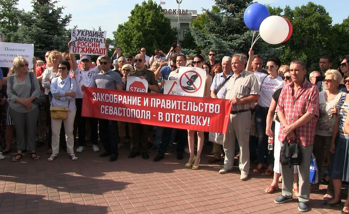 Участники митинга держали плакаты "Заксобрание (оккупационный "парламент" города, бывший Севастопольский горсовет) и правительство Севастополя – в отставку!", "В Украине заработал, в России – отжимают!", "Суды в Севастополе – против людей", "Остановите судебный беспредел!", "Помогите отстоять свою собственность!" и прочими.