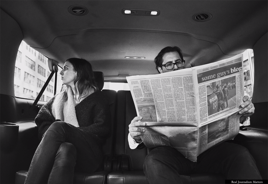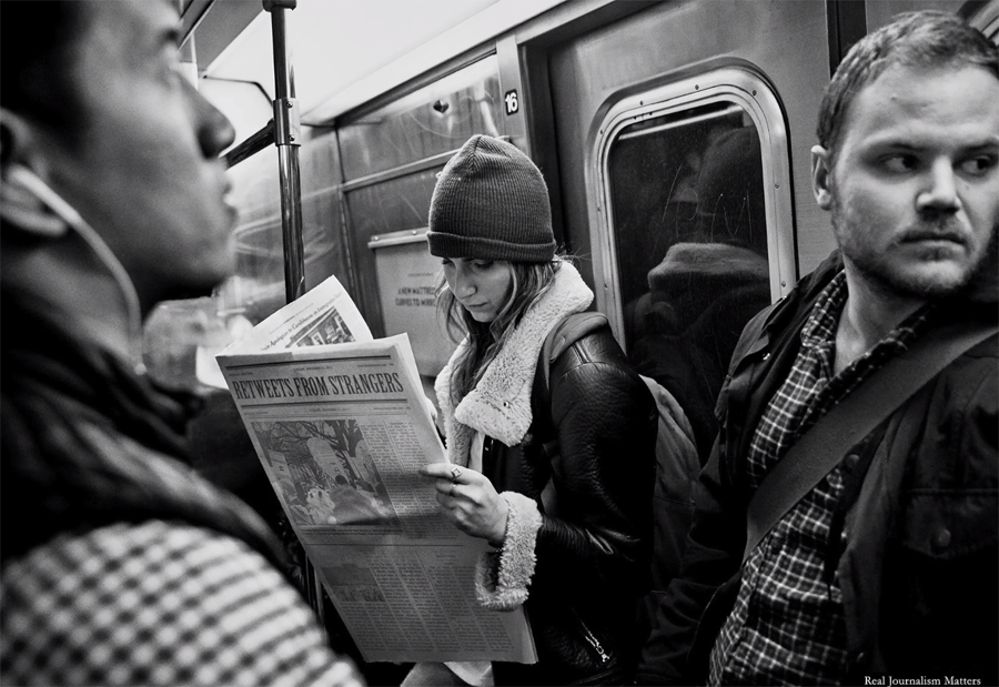На опубликованных снимках запечатлено, как рядовые американцы читают газеты. На первый взгляд все три фотографии ничем не примечательны, но при ближайшем рассмотрении становится понятно, что названия изданий заменены на источники, которые у современных читателей пользуются гораздо большей популярностью, чем авторитетные СМИ: «Блог какого-то парня», «Папин пост в фейсбуке» и «Ретвиты незнакомцев».