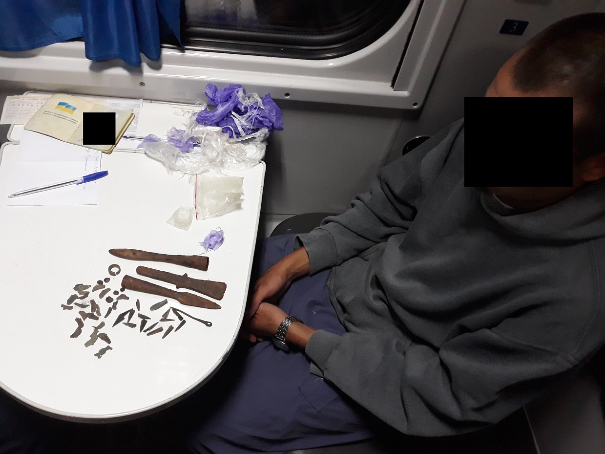 Під час перевірки одного з вагонів потяга «Кривий Ріг-Москва», прикордонники Харківського загону виявили громадянина 1978 року народження, стосовно якого було доручення уповноважених державних органів. В ході огляду речей громадянина спільною групою співробітників Держприкордонслужби, Служби безпеки України та митниці в дорожній сумці було виявлено історичні цінності. Серед виявленого - 17 наконечників для стріл та списів скіфських часів, 27 монет Ольвії, скіфську сокиру, металеву обручку та металеву голку.