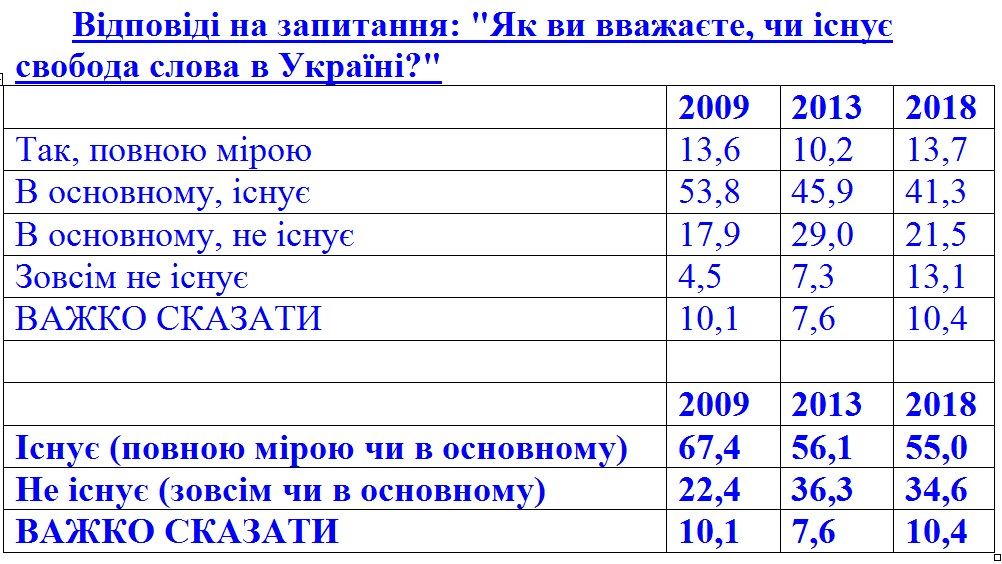 Уровень восприятия свободы слова остался на уровне 2013 года (56%), однако несколько уступает 2009 году, когда 67% украинцев были уверены в существовании свободы.