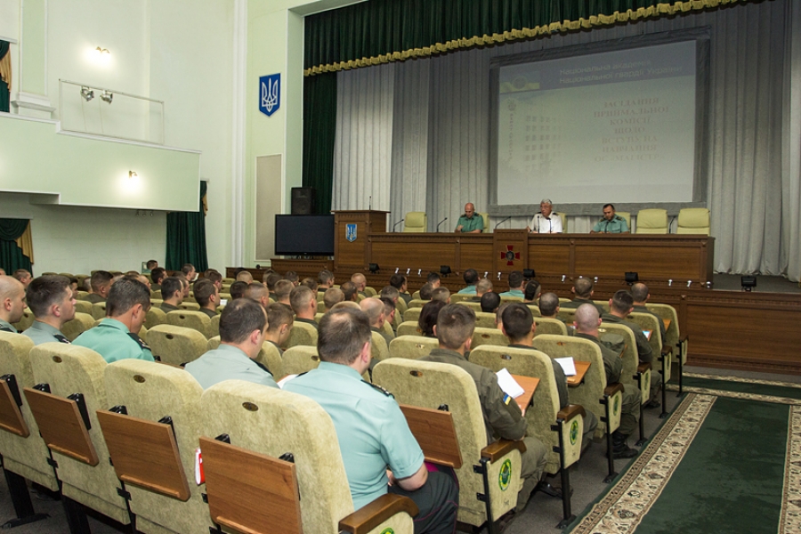 Керівництво Національної академії Національної гвардії України зустрілися з військовими абітурієнтами, які прибули для здачі іспитів. Начальник Академії генерал-майор Сергій Соколовський розповів присутнім про навчальний заклад, представив керівний склад, та надав основну інформацію щодо вступних випробувань.