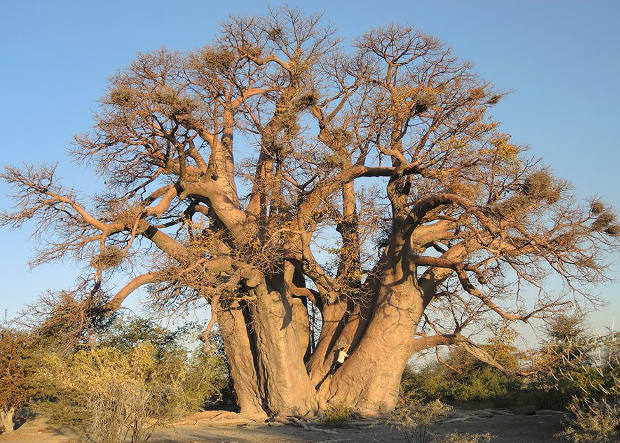 Африканские баобабы (Adansonia digitata) — одни из самых больших и долгоживущих цветковых деревьев, которые растут в саваннах между 16 градусом северной и 26 градусом южной широты. У самых толстых и старых деревьев диаметр достигает восьми метров, а высота — 25 метров. Баобабы могут доживать почти до двух тысяч лет.В сезон дождей они накапливают влагу в стволе и расходуют ее в засушливое время года. Древесину баобабов любят слоны, они съедают ее и одновременно утоляют жажду; а плодами баобабов охотно лакомятся обезьяны. Люди используют в пищу листья, семена и плоды, из коры делают волокно, а из него — веревки, мешки и одежду.