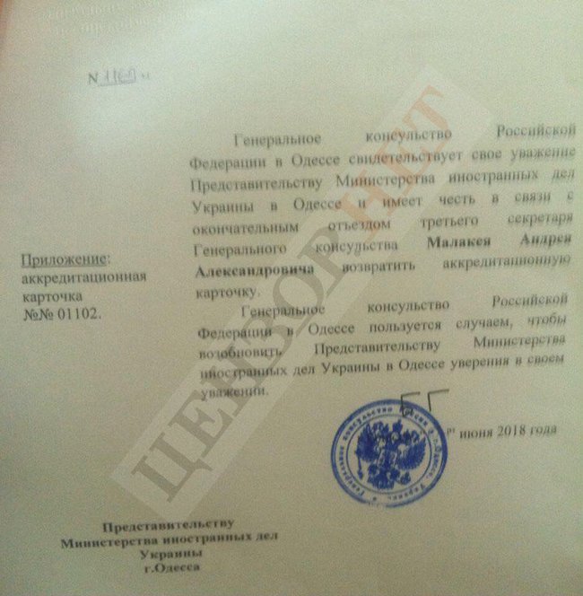 Министерство иностранных дел России в срочном порядке отозвало из Украины третьего секретаря Генерального консульства РФ в Одессе Андрея Малакея. Об этом сообщает «Цензор.НЕТ».