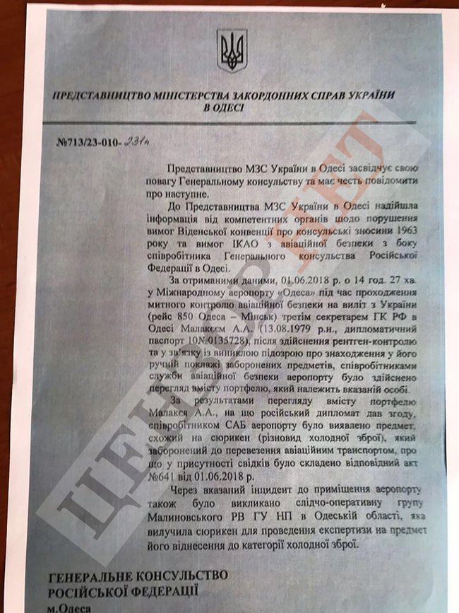 «1 июня 2018 года во время прохождения багажного контроля российским дипломатом Малакеем в международном аэропорту «Одесса» возникло подозрение о нахождении в его портфеле запрещенных предметов. По итогам санкционированного дипломатом обыска был обнаружен похожий на сюрикен предмет», – сообщает издание.