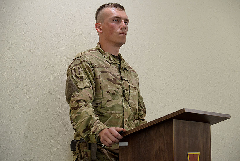 Старший лейтенант Денис Прокопенко приділив особливу увагу бойовій історії підрозділу, зокрема такій її сторінці, як звільнення Маріуполя від терористів чотири роки тому. Також йшлося про бойові завдання, які «Азов» виконує сьогодні.