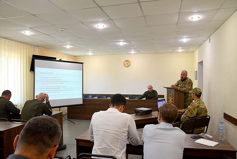 Командир батальйону вишколу особового складу розповів гостям з Канади про навчальний підрозділ, напрямки та підходи які застосовуються в підготовці рекрутів, сержантів та офіцерів. Канадців зацікавило те, що "Азов" в своїй роботі вже зараз використовує систему управління, яка застосовується в країні НАТО.