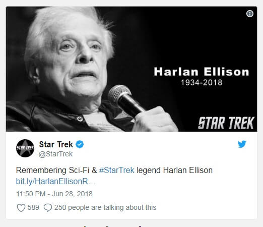 В США скончался один из сценаристов сериала «Звездный путь», известный писатель-фантаст Харлан Эллисон. За свою жизнь он получил 16 премий «Хьюго» и «Небьюла», считающихся одними из самых престижных в области научной фантастики.