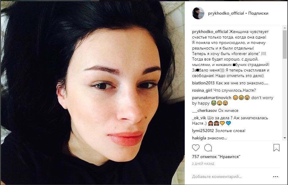 "Женщина чувствует счастье только тогда, когда она одна! Я поняла что происходило, и почему реальность и я были отдельны! Теперь я хочу быть forever alone! Тогда все будет хорошо, с душой, мыслями, и никаких *бучих страданий! За*бало меня! Я теперь счастливая и свободная! Надо отметить это дело", - написала в фотоблоге Приходько.