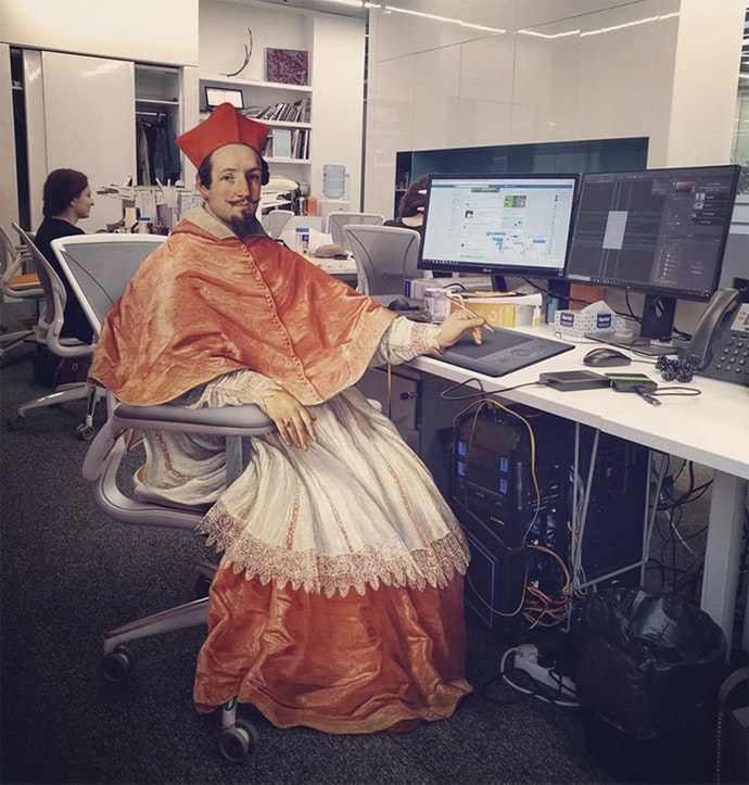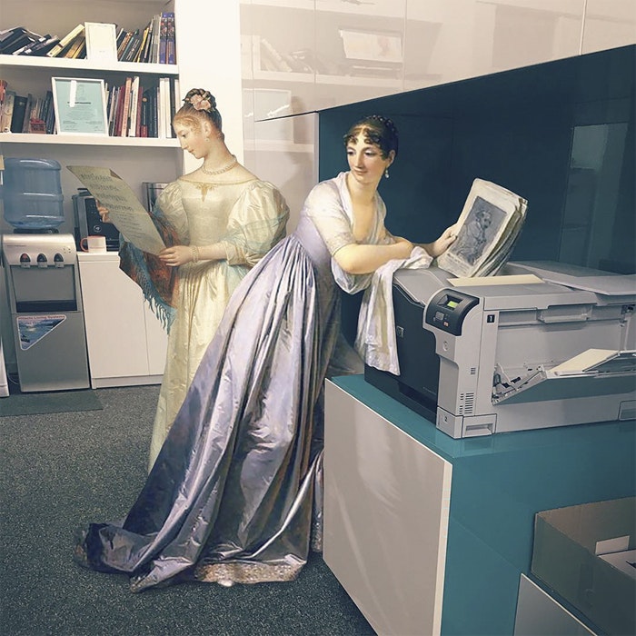 Украинская художница Алла Мингалева выкладывает в своем инстаграме коллажи, в которых помещает героев классических полотен на современные фотографии. По ее словам, над этой серией она работает около года, а ее любимая часть проекта — внедрять персонажей картин в офисную обстановку.