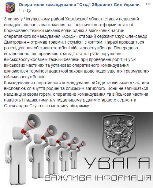 Между тем, уже после публикации о гибели бойца ВСУ и явного несоответствия с информацией пресс-центра ООС о том, что погибших за 3 июня в боях нет, оперативное командование "Схид" опубликовало информацию о трагической гибели бойца.