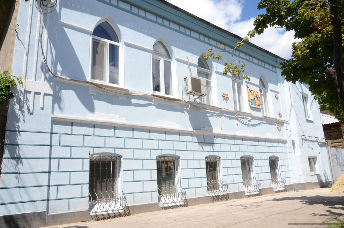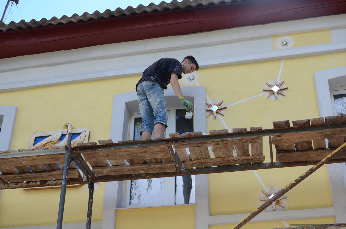 Сейчас там работают строители и художники. Работа первых заключается в том, чтобы снять старый аварийный слой штукатурки, очистить, вымыть фасад от прежней краски, сделать цементную стяжку, нанести современные материалы и окрасить фасад.