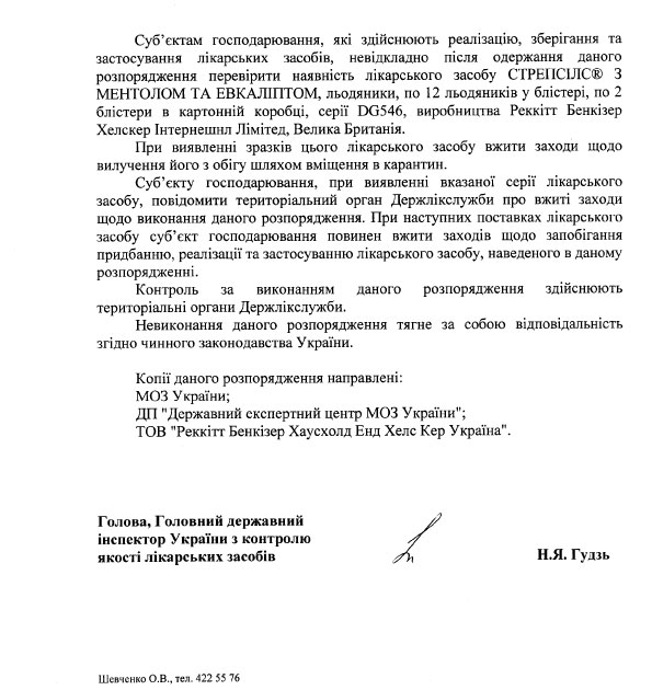 "Временно запрещаю реализацию и применение лекарственного средства "Стрепсилс с ментолом и эвкалиптом", леденцы, по 12 леденцов в блистере, по 2 блистера в картонной коробке, серии DG546, производства "Реккитг Бенкизер Хелскэр Интернешнл Лимитед", Великобритания, до отдельного решения Государственной службы Украины по лекарственным средствам и контроля за наркотиками", - говорится в распоряжении, подписанном главным государственным инспектором Украины по контролю качества лекарственных средств Натальей Гудзь.