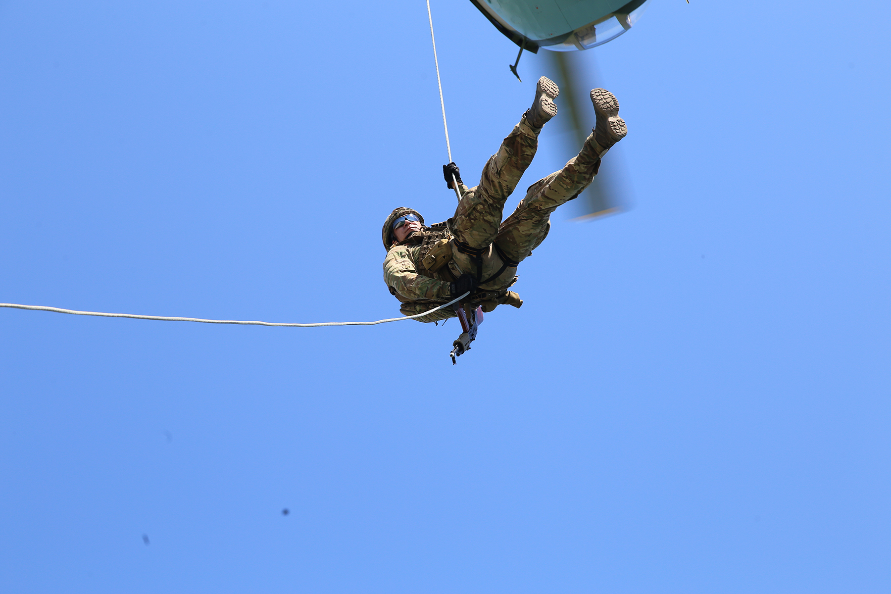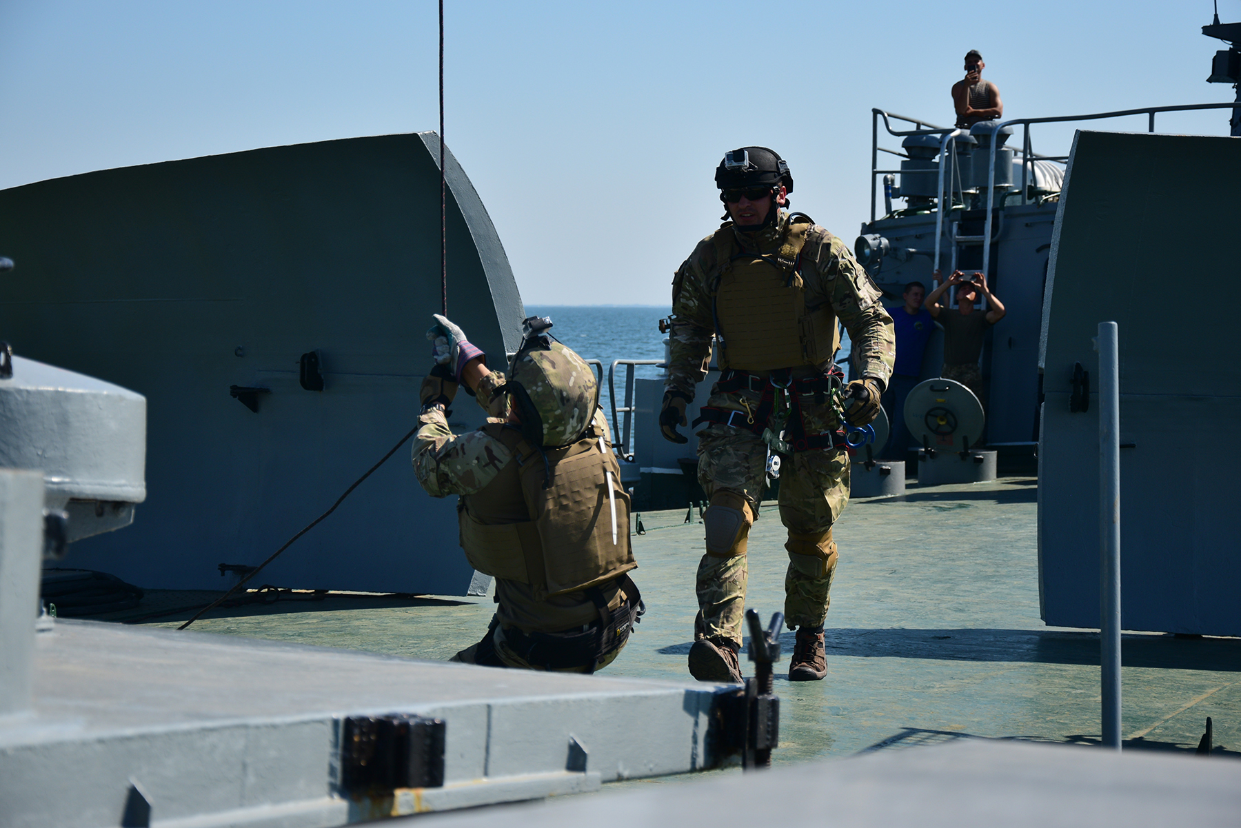 "Элемент непростой и опасный, ведь необходимо учесть силу и направление воздушных потоков под винтами вертолета, рассчитать натяжку специального спускового устройства, сделать поправку на волнение моря и тому подобное. Поэтому «обкатать» высадку поручили бойцам специальных подразделений - подразделений специального назначения Морской охраны Госпогранслужбы и спецназовцам ВМС ВСУ.