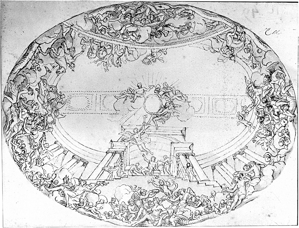 Французский дворец в стиле барокко Во-ле-Виконт, послуживший прототипом Версальского дворца Людовика XIV, остался без монументальной фрески Шарля Лебрена, которая должна была украсить его центральный зал. Лебрен, художник и декоратор большого имения Менси, расположенного к юго-востоку от Парижа, как раз собирался приступить к росписи потолков в центральном зале, когда в 1661 году его покровитель Николя Фуке, королевский суперинтендант финансов, был арестован по обвинению в предательстве и расхищении государственной казны.