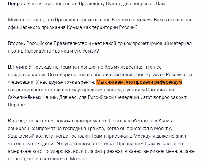 Мы считаем, что провели референдум в строгом соответствии с международным правом, с уставом Организации Объединённых Наций. Для нас, для Российской Федерации, этот вопрос закрыт - В.Путин, версия официального сайта.