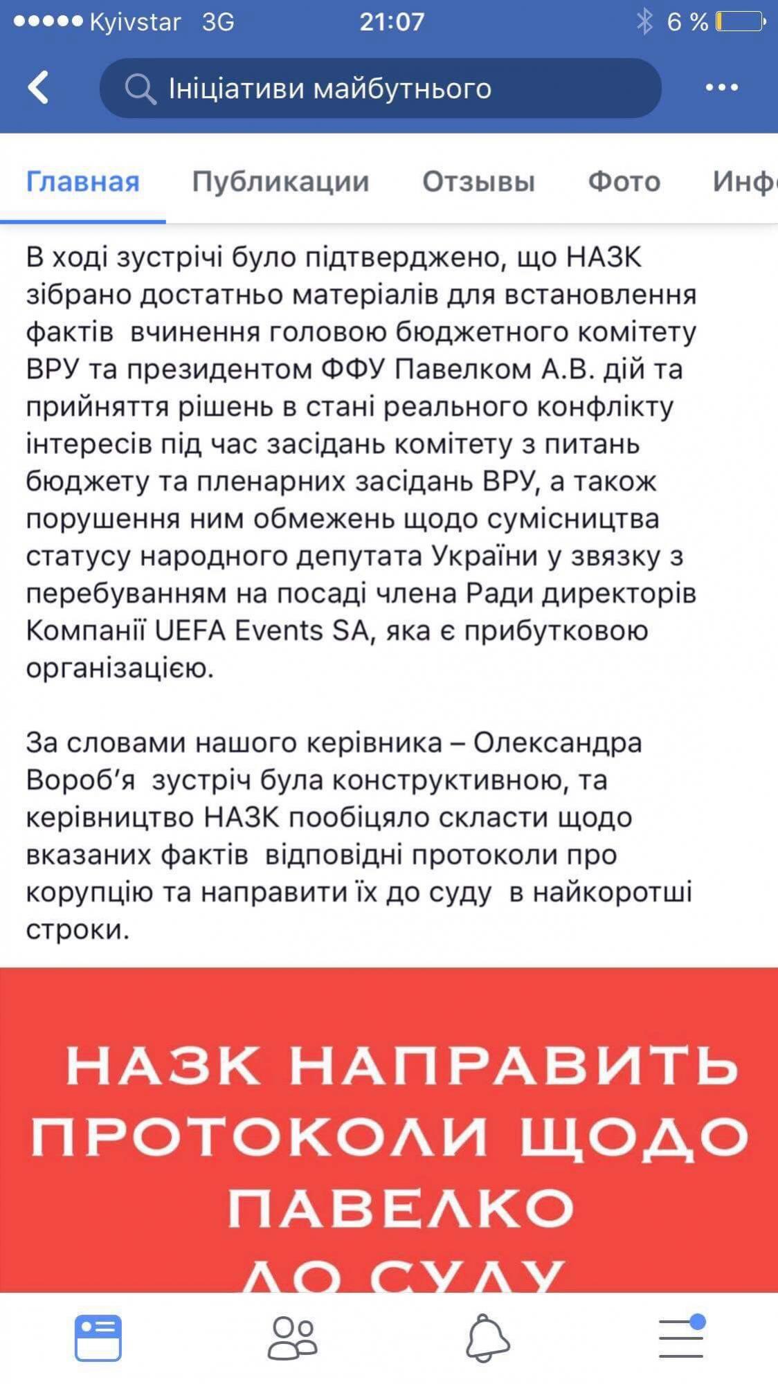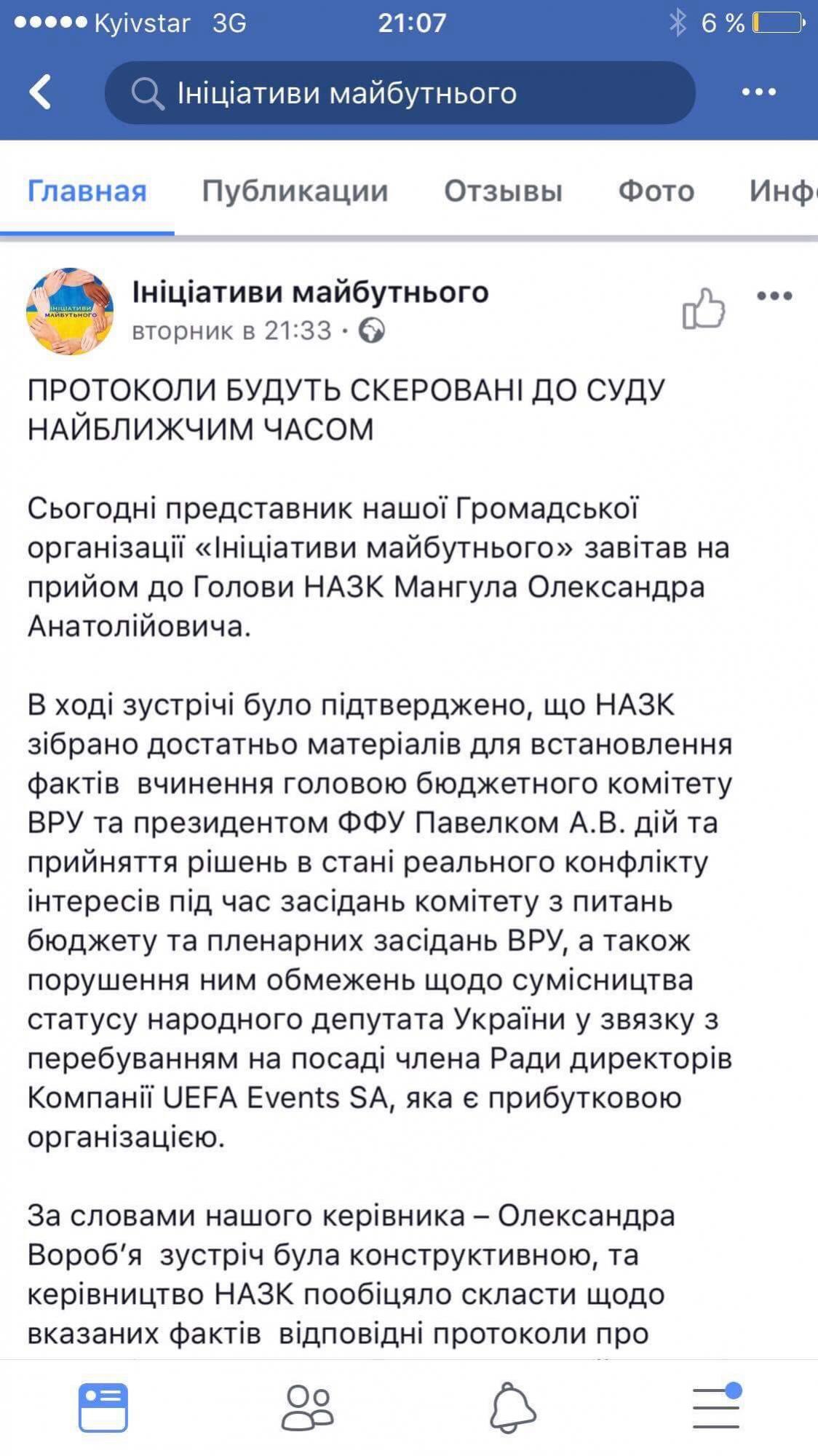 10 июля на странице ОО «Инициативы будущего» в Фейсбук появилось сообщение о том, что их глава Александр Воробей якобы имел личную встречу с главой НАПК Александром Мангулом.