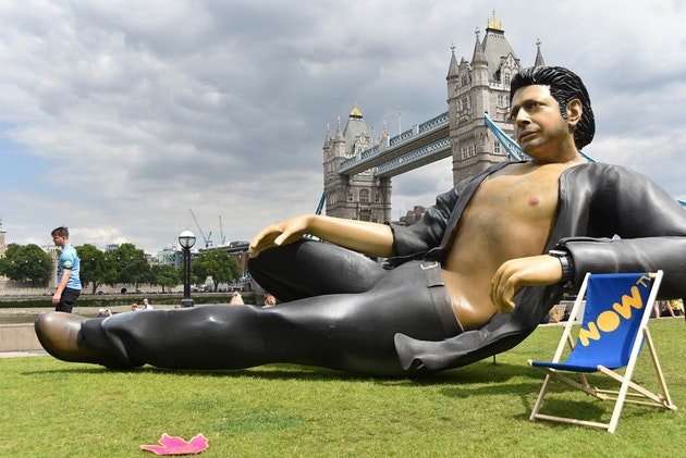 Статуя получила название «Сексуальный Джефф Голдблюм». В длину она достигает семи метров, в высоту — около трех, вес объекта — 150 килограммов. Как сообщаетThe Hollywood Reporter, пластиковую статую заказал стриминговый сервис Now TV к 25-летию оригинального «Парка Юрского периода». Фигура Голдблюма пробудет у Тауэрского моста до 26 июля, затем ее уберут.