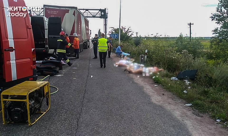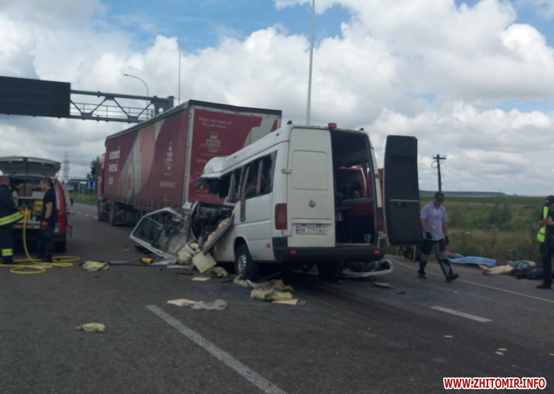 За попередніми відомостями, водій маршрутного автобусу (вірогідно, сполученням Київ – Рівне), рухаючись у напрямку м. Житомира, скоїв зіткнення з вантажівкою «DAF» з напівпричепом.