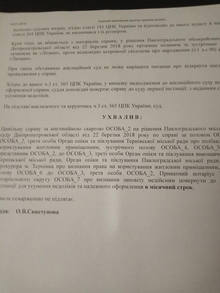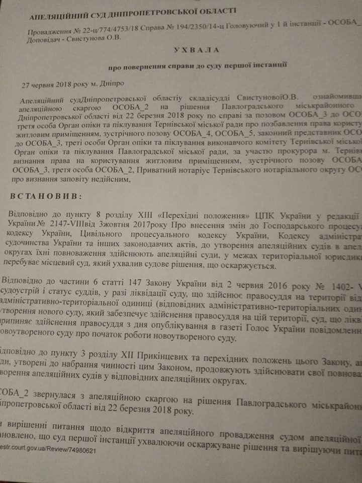 Насколько я понял, Людмила с семьей, мамой и двумя детьми, жила в квартире, которая досталась ей в наследство от крестного. Но в марте 2018 года, когда старший сержант Калинина еще служила в 46-м отдельном батальоне специального назначения ВСУ, в Павлоградском горрайонном суде семейство местных юристов М. оспорило завещание - и суд принял решение (№194/2350/14-ц от 22.03.2018), по которому владельцами квартиры вдруг стал один из М. , причем по этому решению были "сняты с с регистрации места проживания" (проще говоря - "выписаны" из квартиры) дочь Людмилы, которая учится в военном лицее, и 11-летний младший сын.
