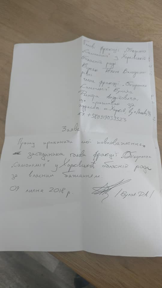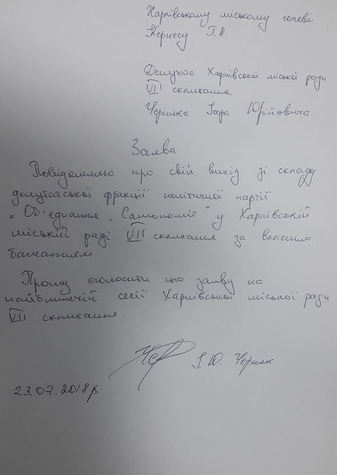 Я принял решение выйти из состава фракции "Объединение "Сампомич" в Харьковском горсовете, а также - вышел из числа членов партии.