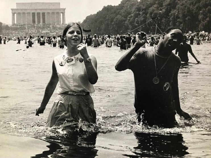 Хольцман 73 года, она переехала в Вашингтон в начале 60-х годов с Гавайев, где росла в семье француженки и гавайца китайского происхождения. В Вашингтоне Мишель работала в государственном агентстве, которое занималось программами, поддерживающими бедные слои населения. Как вспоминает Хольцман, в тот день начальство попросило сотрудников агентства помочь волонтерам раздать еду протестующим на Национальной аллее. Прибыв на место, волонтеры обнаружили, что активисты прыгают в «Отражающий бассейн» — пруд у мемориала Линкольна. И Хольцман решила присоединиться к ним. По словам Мишель, коллеги отговаривали ее залезать в пруд, говоря, что она испортит свои новые кожаные сандалии. Хольцман отмечает, что сначала ей было очень неловко, но потом к ней подошел юноша — второй герой фотографии Бенсингера, — и они начали петь госпел. Даже если молодой человек и представился, то Мишель уже давно забыла его имя: для нее тот день был радостным и спонтанным мгновением.