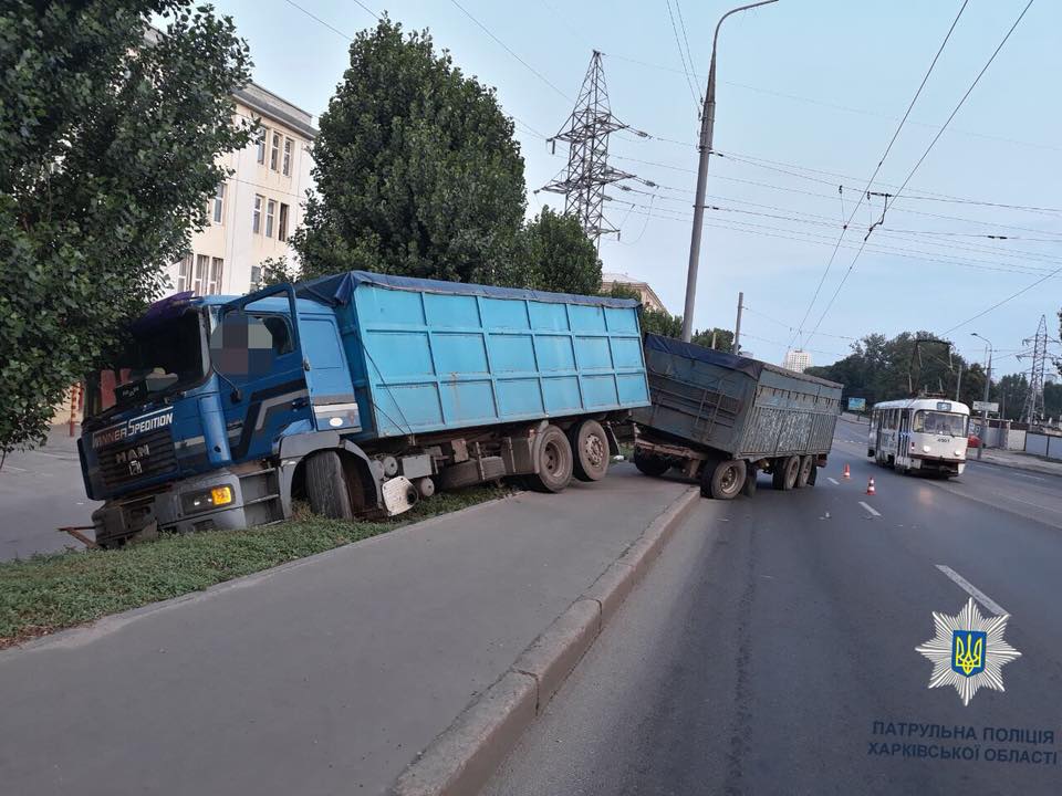По информации патрульной полиции города, водитель автомобиля "Man" с прицепом не учел дорожной обстановки, не справился с управлением и совершил наезд на бордюрный камень.