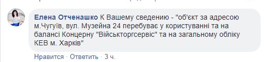 К Вашему сведению - "об'єкт за адресою м.Чугуїв, вул. Музейна 24 перебуває у користуванні та на балансі Концерну "Військторгсервіс" та на загальному обліку КЕВ м. Харків"