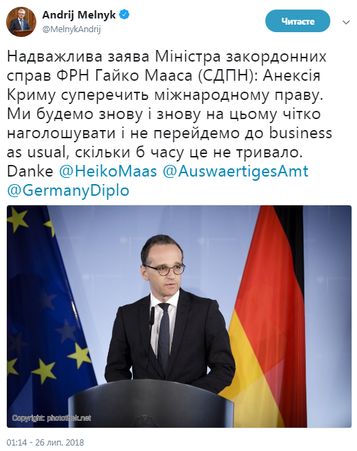В заявлении министра иностранных дел Германии Хайко Мааса говорится, что "аннексия Крыма противоречит международному праву".
