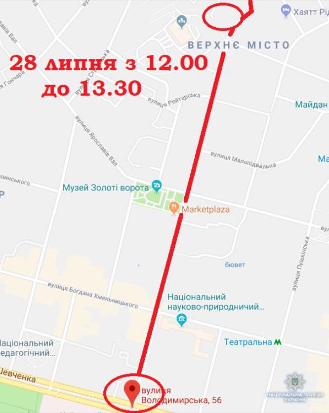 27 липня з 11:00 до 16:30 перекриють вул. Трьохсвятительську (від пл. Михайлівської до пл. Європейської), Хрещатик (від вул. Михайлівської до пл. Європейської), Володимирський узвіз (від пл. Поштової до пл. Європейської), Паркову дорогу (від алеї Героїв Крут до вул. Михайла Грушевського), вул. Михайла Грушевського (від вул. Шовковичної до пл. Європейської).