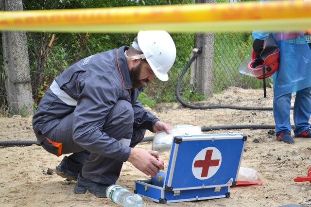 Внезапно условия задания меняются: слесарь должен потерять сознание, у него перелом ноги ниже колена. Находящиеся на поверхности члены бригады вытаскивают слесаря, вызывают скорую и накладывают шину на поврежденную ногу. За процессом придирчиво наблюдает медик, который дает свою оценку качеству оказания доврачебной помощи.
