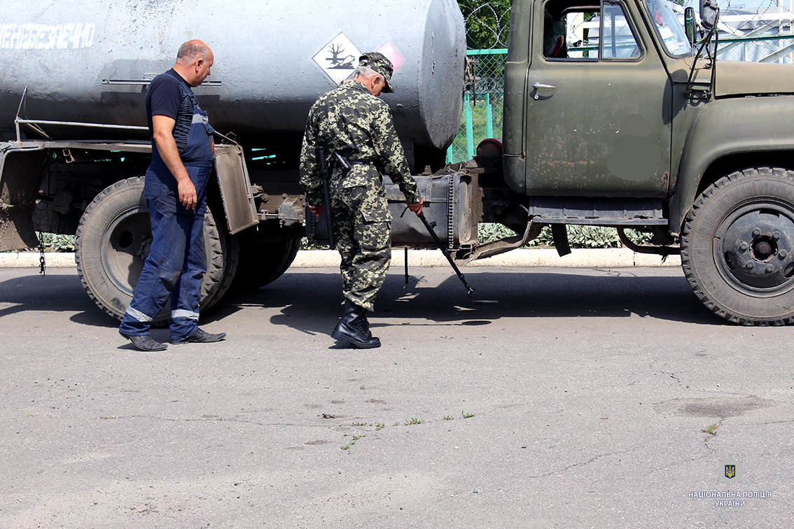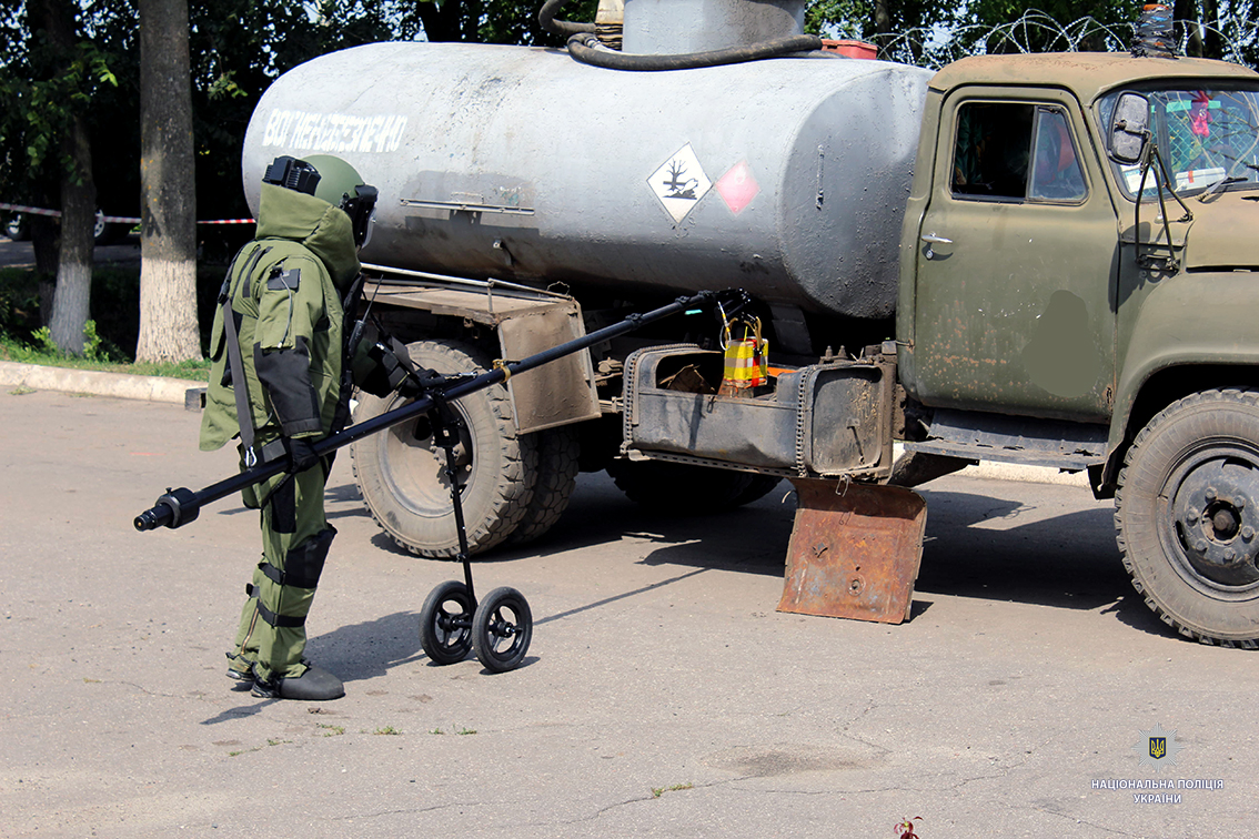 На другому етапі навчань на контрольно-пропускному пункті об’єкту контролер недержавної охоронної фірми під час огляду транспортного засобу виявив підозрілий предмет. Старший зміни повідомив про подію співробітникам Управління поліції охорони та керівництву об’єкту. Негайно були організовані заходи щодо посилення контролю території об’єкту, евакуації персоналу та ліквідації можливої пожежі. Місцевість навколо автомобіля з умовним вибуховим пристроєм обмежили попереджувальними стрічками. В той же час, працівники вибухотехнічного управління провели дослідження вибухового пристрою та за його результатами вжили відповідні заходи.