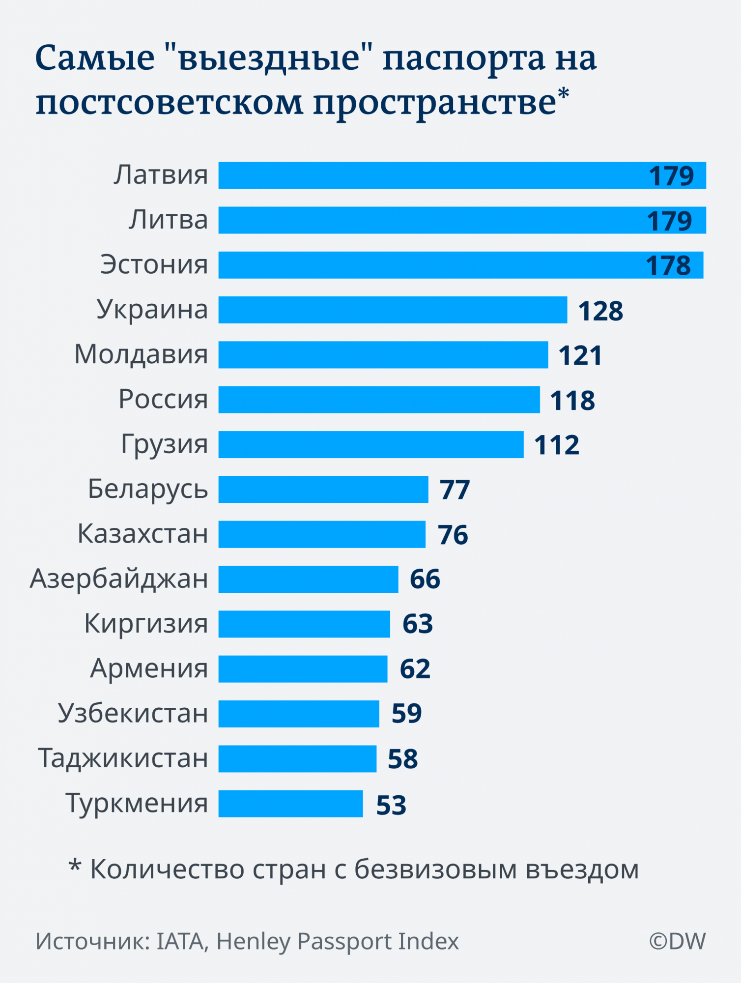 Между тем самыми выгодными на постсоветском пространстве паспортами для путешествий по миру обладают граждане Латвии и Литвы, имеющие безвизовый режим со 179 странами. Эстония отстает всего на одну страну: ее граждане могут путешествовать без визы в 178 стран.