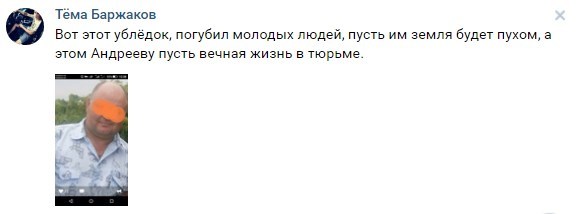 "Вот этот ублюдок, погубил молодых людей. Пусть им земля будет пухом. А этому Андрееву пусть вечная жизнь в тюрьме", - написал Тёма Баржаков, которого цитирует Обозреватель.