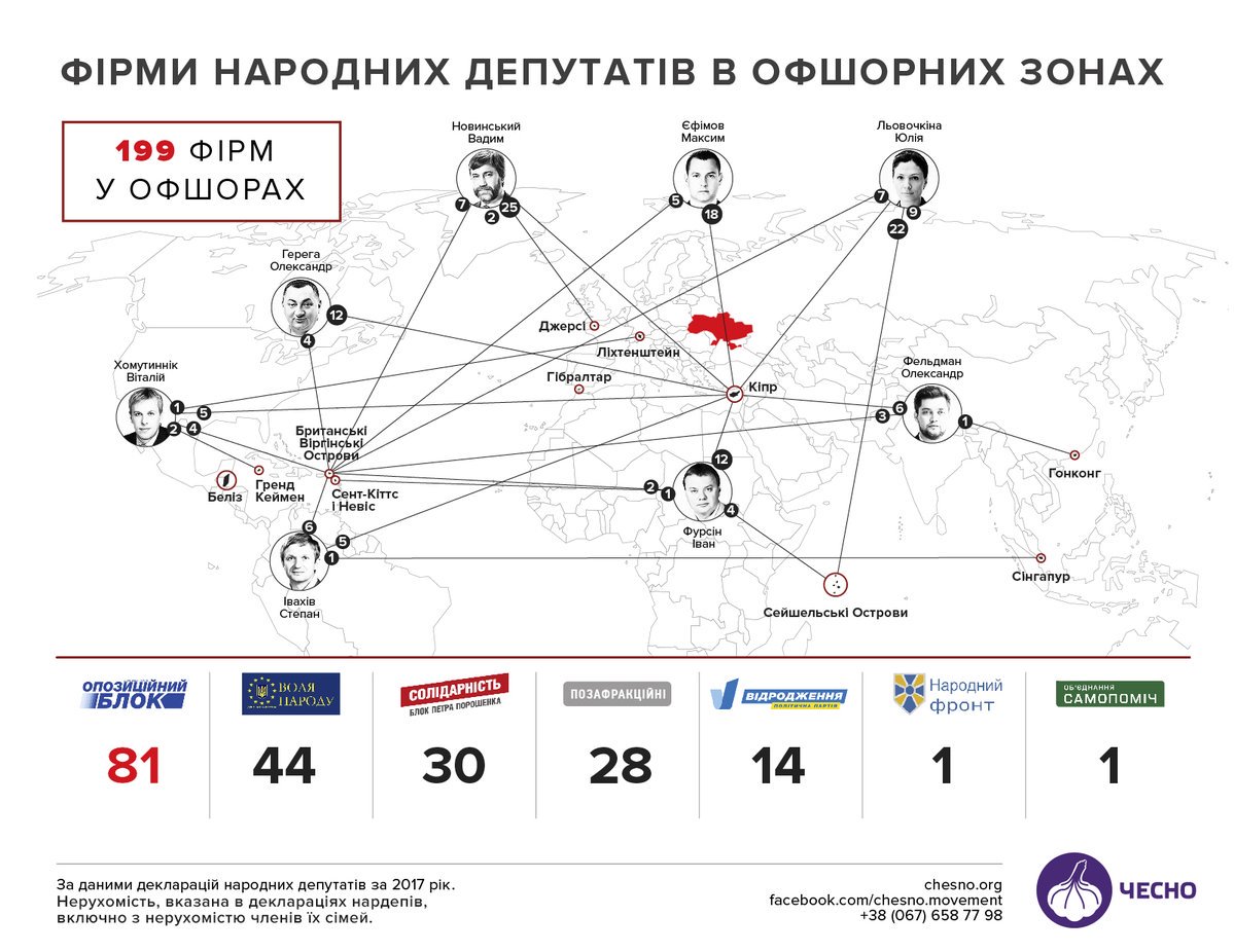 Гражданское движение "Чесно" опубликовало данные о фирмах народных депутатов в Украине, зарегистрированных в офшорных зонах.