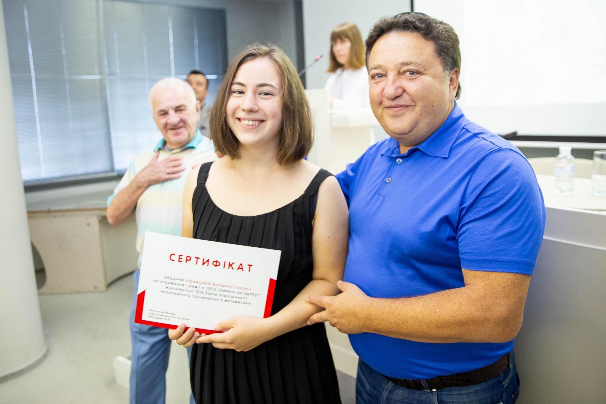 Сертификаты от народного депутата в этот день получили 27 выпускников-отличников, несколько человек, в частности те, кто уехал поступать в иностранные вузы, получили премии раньше (всего в Харьковской области в этом году максимальные баллы получил 31 выпускник, что является лучшим показателем в Украине и рекордом за все годы проведения внешнего независимого оценивания).