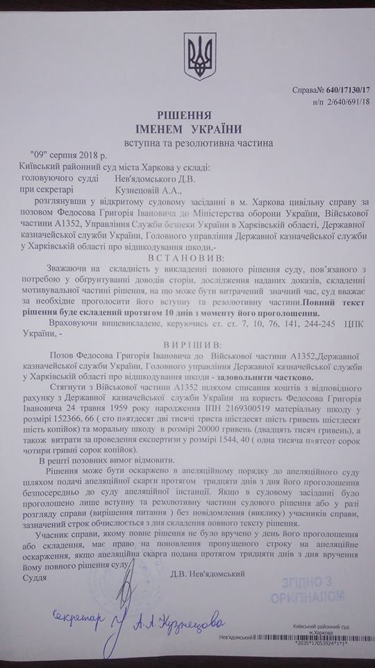 09.08.18 року Київський районний суд міста Харкова, де інтереси Григорія Федосова представляла адвокат #Чугуївська_правозахисна_група Світлана Кужелєва виніс рішення, яким вирішив