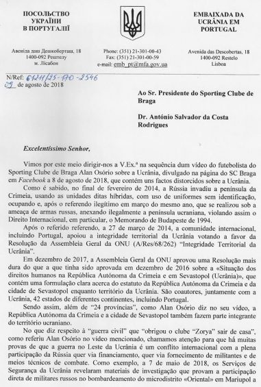 — Помимо «24 провинций», как говорит Алан Озориу в своем видео, Республика Крым и город Севастополь также являются неотъемлемой частью территории Украины. Что касается «гражданской войны», которая «вынудила клуб «Заря» покинуть дом», как отметил Алан Озориу в упомянутом выше видео, мы хотели бы отметить, что есть много свидетельств о том, что война на востоке Украины является международным конфликтом с полным участием России, либо путем финансирования, либо посредством предоставления технических средства ведения боя, — говорится в обращении посольства к президенту «Браги». — Война, спровоцированная и возглавляемая Россией против Украины в течение последних четырех лет привела к более 10 000 жертв… Вышеупомянутое видео вводит в заблуждение португальского зрителя, особенно о статусе Крыма и войне, проводимой Россией против Украины. Поэтому мы просим, чтобы эти факты были исправлены.