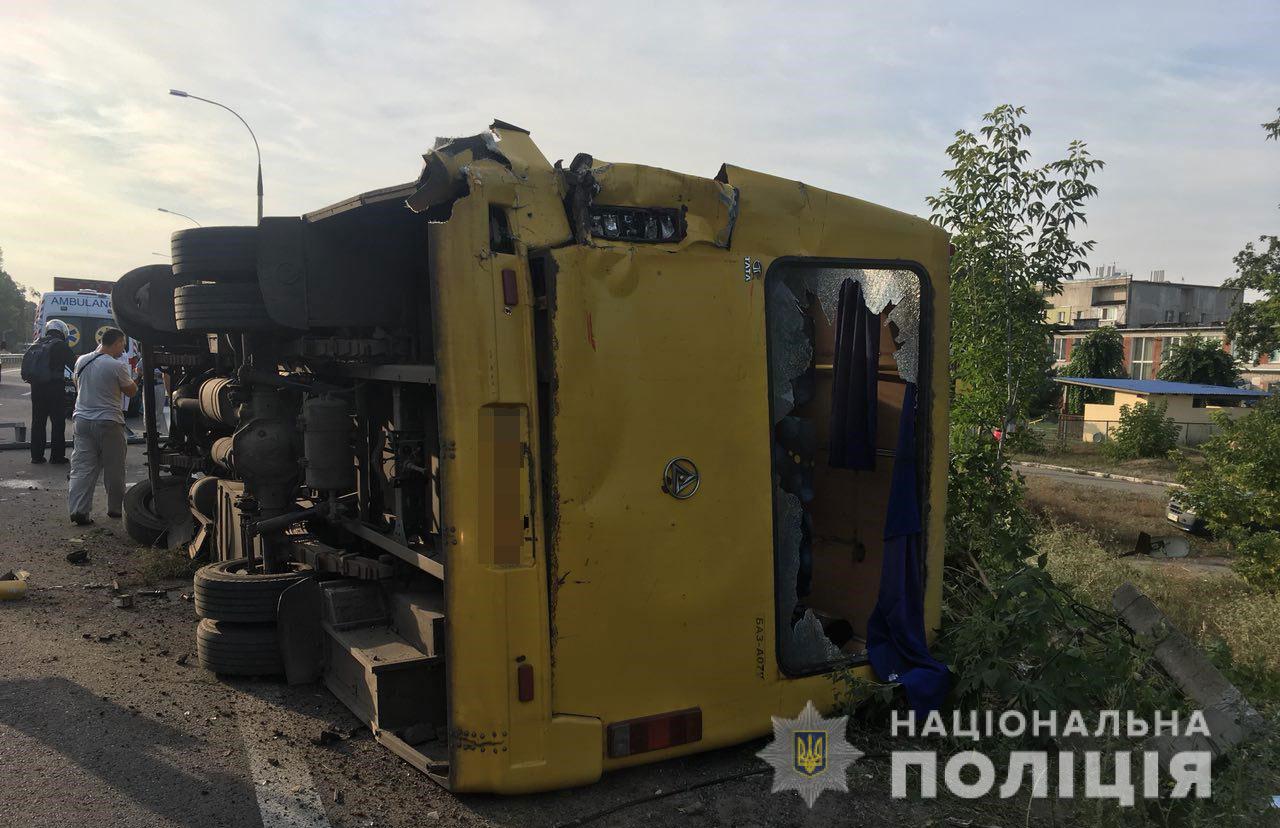 Дорожно-транспортное происшествие произошла 20 августа около 7:00 на Полтавском шоссе вблизи пгт. Обуховка Днепровского района. По предварительным данным, автобус двигался по правой крайней полосе, когда его догнал грузовой автомобиль. В результате столкновения автобус с пассажирами перевернулся на правый бок.