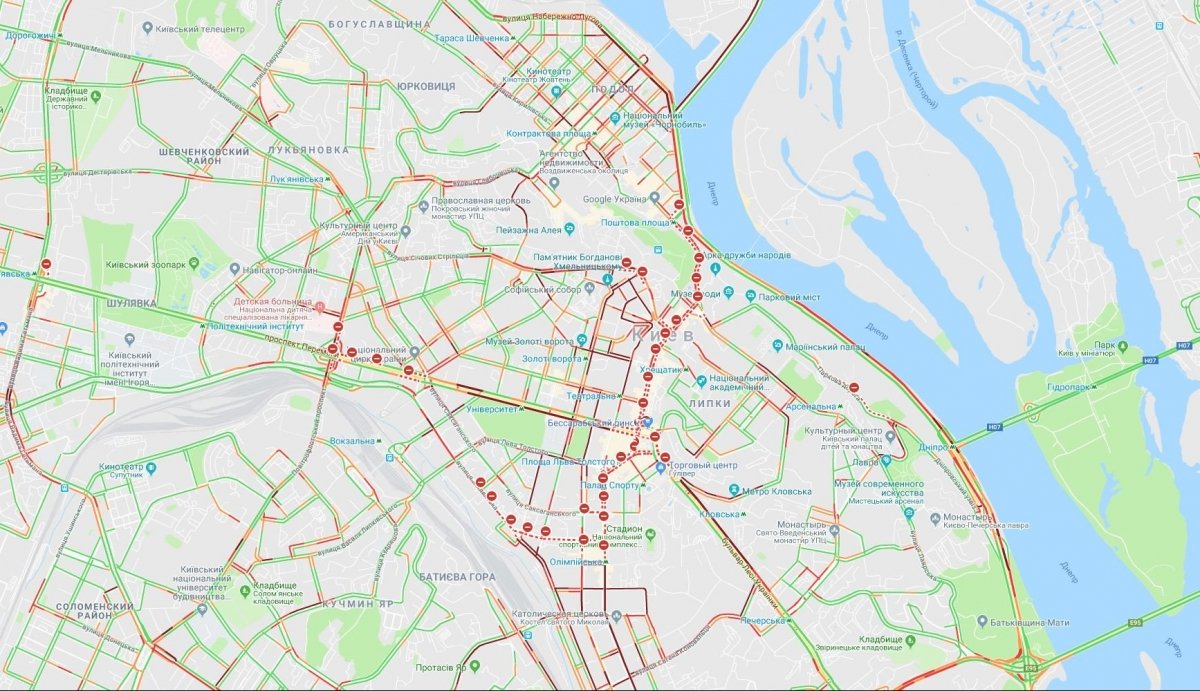 У понеділок, 20 серпня, середмістя Києва паралізувало через проведення низки заходів, що пов'язані з підготовкою до параду на честь Дня Незалежності України. Про це свідчать дані сервісу Google Maps й численні дописи обурених киян.